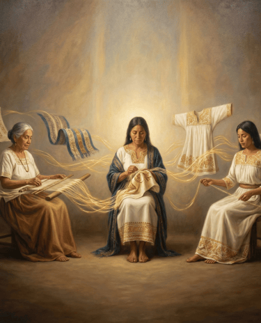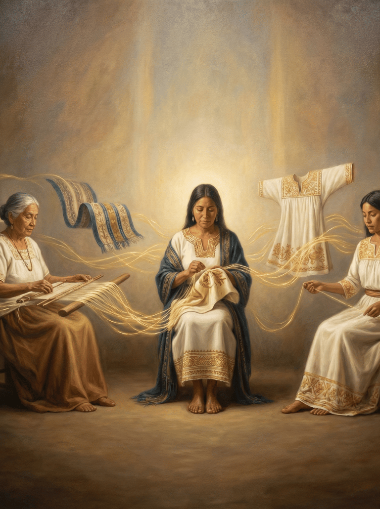 Les vêtements du quotidien, les tenues sacrées, les habits nuptiaux et les parures cérémonielles sont le fruit de cette chaîne féminine ininterrompue.